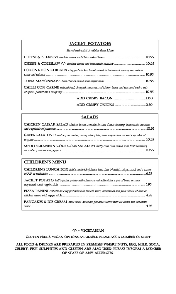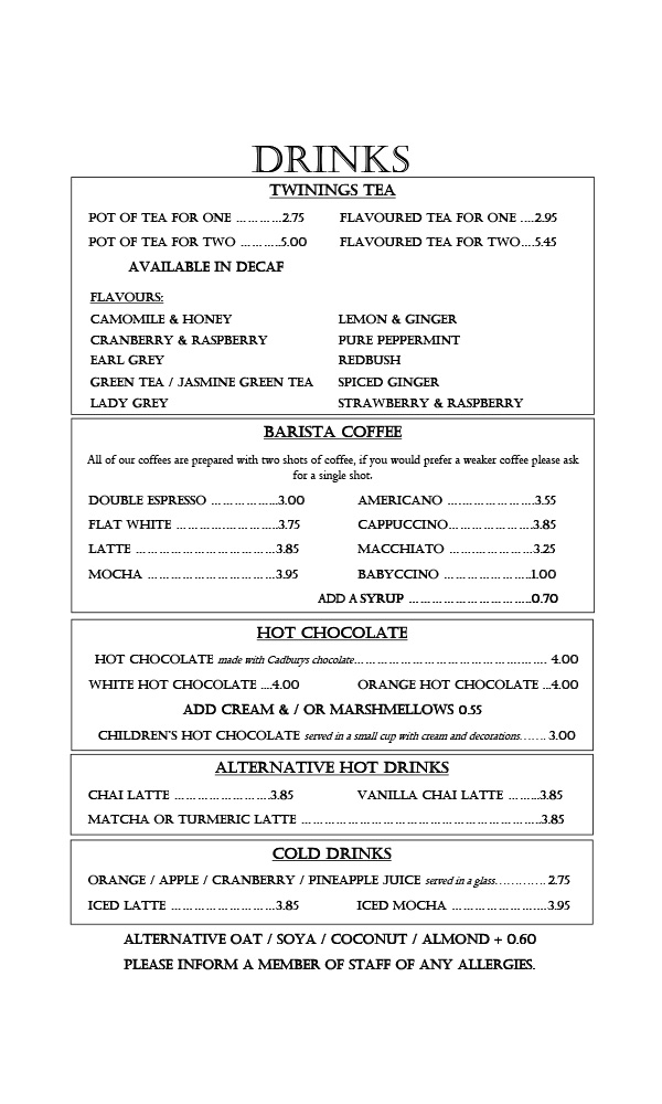 All food & drinks are prepared in premises where nuts, egg, milk, soya, celery, fish, sulphites and gluten are also used. Please inform a member of staff of any allegies.